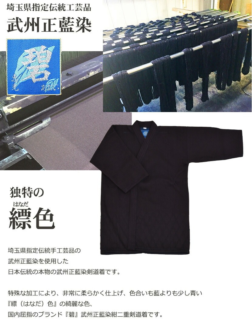 埼玉県指定伝統手工芸品の武州正藍染を使用した日本伝統の本物の武州正藍染剣道着です。