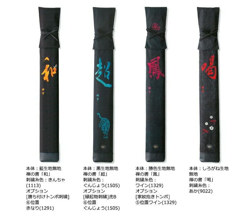 竹刀袋本体の色とサイズ、大きな文字刺繍の内容と糸色、その外オプション刺繍を自由に選ぶことができ、
