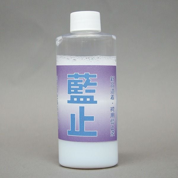 手入れの仕方は商品に解説が載っております。 【 使用方法 】 1)タライなどの大きな容器を用意し、水6Lと藍止液1本をまぜあわせます。 2)道着・袴を浸して良く揉み込んでいただき約30分漬け込んでください。 3)その後、約一週間ほど乾かしておいてください。 内容量:100cc ※こちらの商品は航空便の規制により、 沖縄県その他離島(北海道以外)への発送は出来かねます。