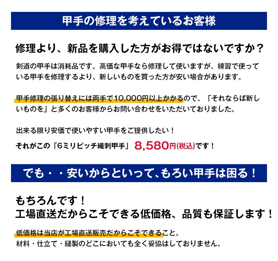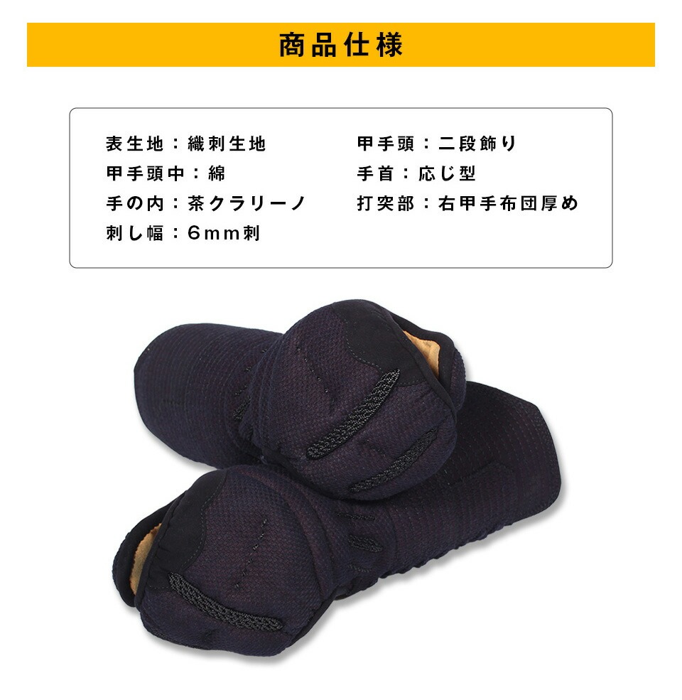 仕様 【甲手布団】 6ミリ刺 【甲手頭】 織刺奴補強付き 二段飾り 【甲手頭中】 綿 【手の内】 茶クラリーノ 【生子】 1段生子 防具についての御質問などございましたら、 担当:坂下までお気軽に御相談下さいませ。 電話番号:075-432-1929、メール:mail@kyotobudo.ocnk.net