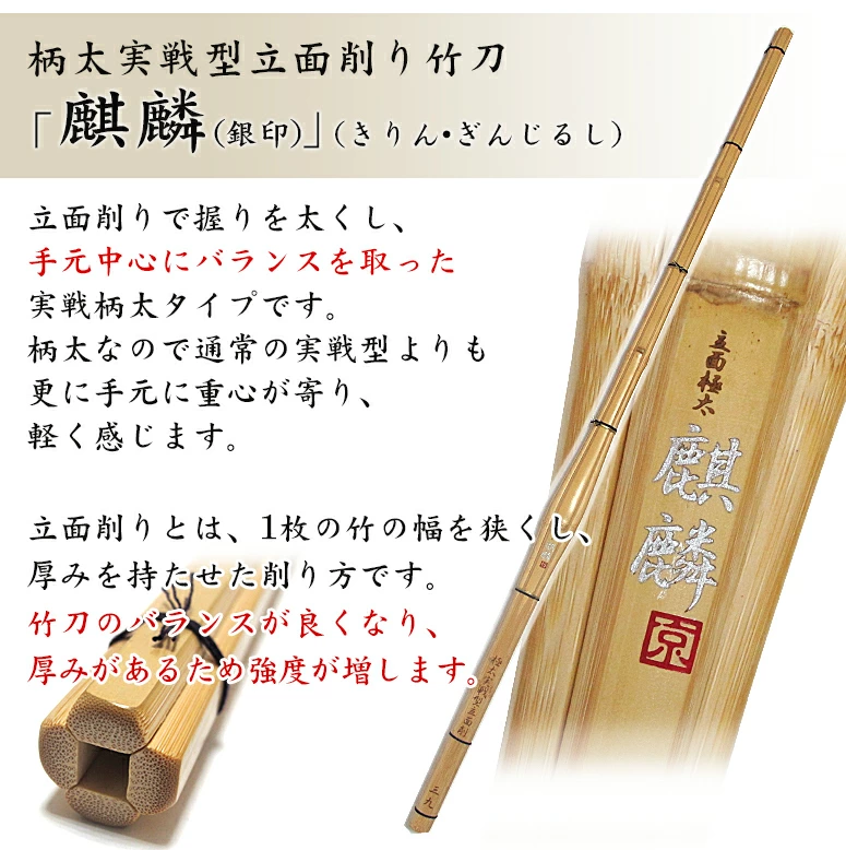 柄太実戦型の竹刀に立面削り加工を施した剣道竹刀です。 立面削りとは剣先の幅を細くし、厚みを持たせた削り方です。 通常の柄より太い握りになっているので、剣先はかなり軽く感じます。 手の小さい方には不向きですが、使いこなせれば強力な武器になる、 試合や審査にお勧めの剣道竹刀です。 38(高校生)男子用の竹のみの販売です。 *複数購入頂きますとお時間を少々頂きますが 竹の節のあったものをお選びしてお送りさせていただきますので 竹が痛みましたときの組み換えにも便利です。